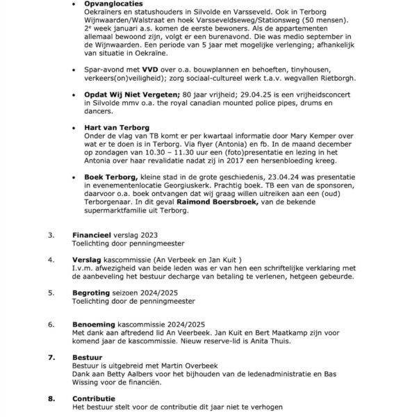 Blij en tevreden was Raimond Boersbroek met het winnen van het historische Terborg, kleine stad in een grote geschiedenis. Het boek werd aan hem overgedragen tijdens de Algemene Ledenvergadering door het nieuwe bestuurslid Martin Overbeek. Het boek biedt zicht op de ontwikkeling en geschiedenis van Terborg tot aan ongeveer 1900. Het werd geschreven en samengesteld door stadsgenoot Willem Willemsen en Peter Bresser.